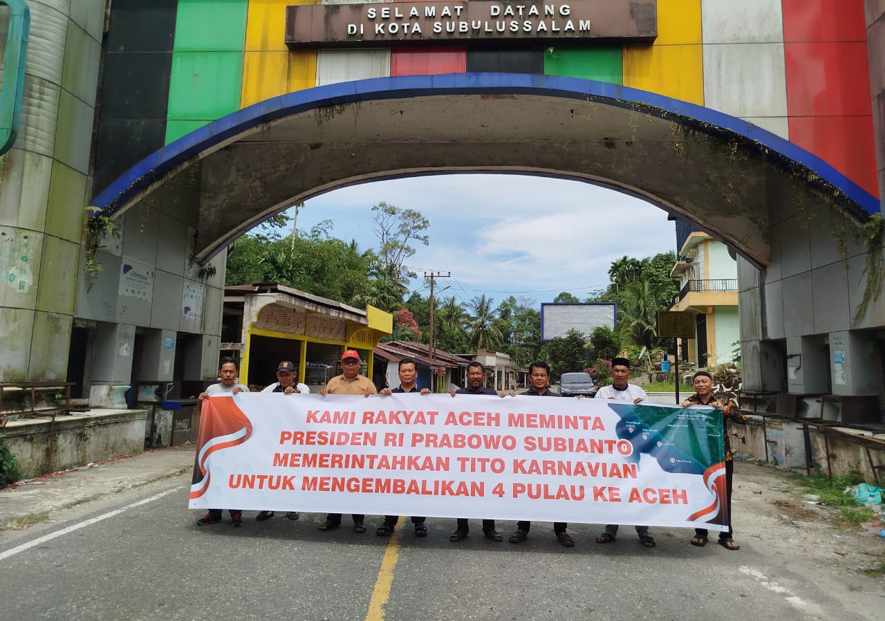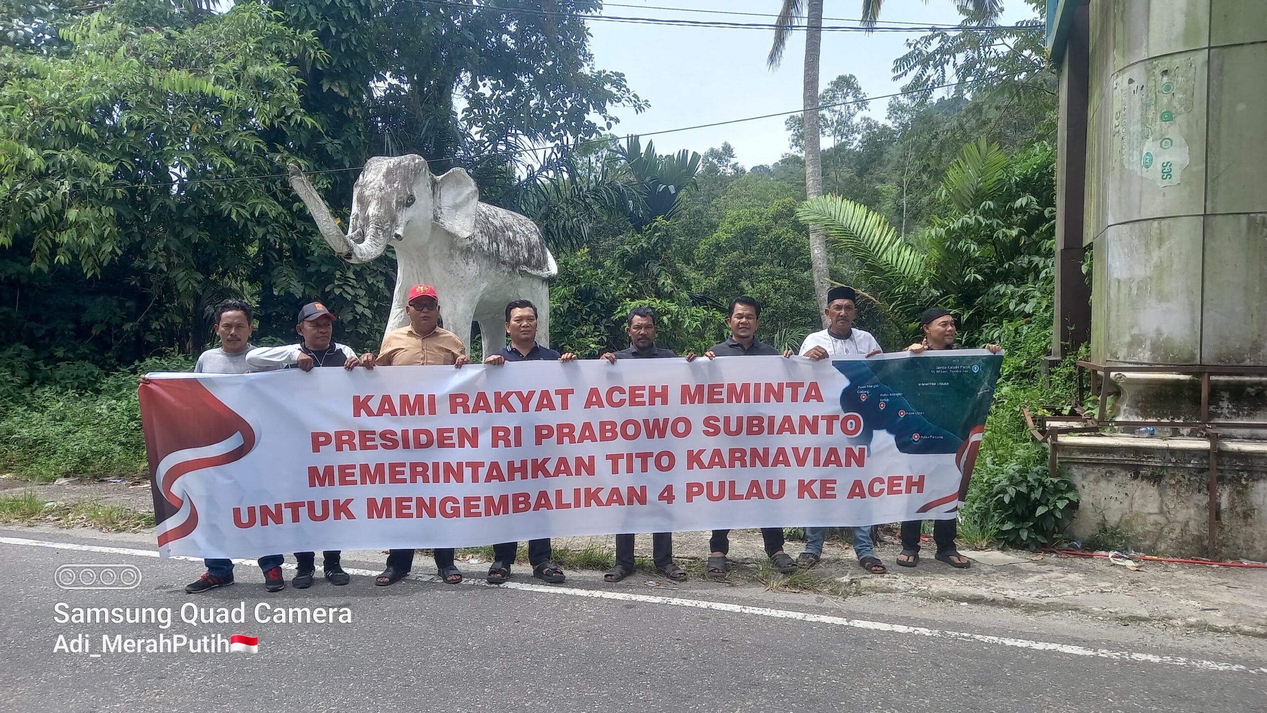 SUBULUSSALAM – Rakyat Aceh dari Kota Subulussalam, Provinsi Aceh, membentangkan spanduk protes di kawasan perbatasan Aceh–Sumatera Utara, tepatnya di Desa Lae Ikan, Kecamatan Penanggalan, Sabtu (14/6/2025). Aksi tersebut merupakan bentuk desakan kepada Presiden RI Prabowo Subianto agar memerintahkan Menteri Dalam Negeri, Tito Karnavian, mengembalikan empat pulau yang diklaim masuk ke wilayah Sumatera Utara.