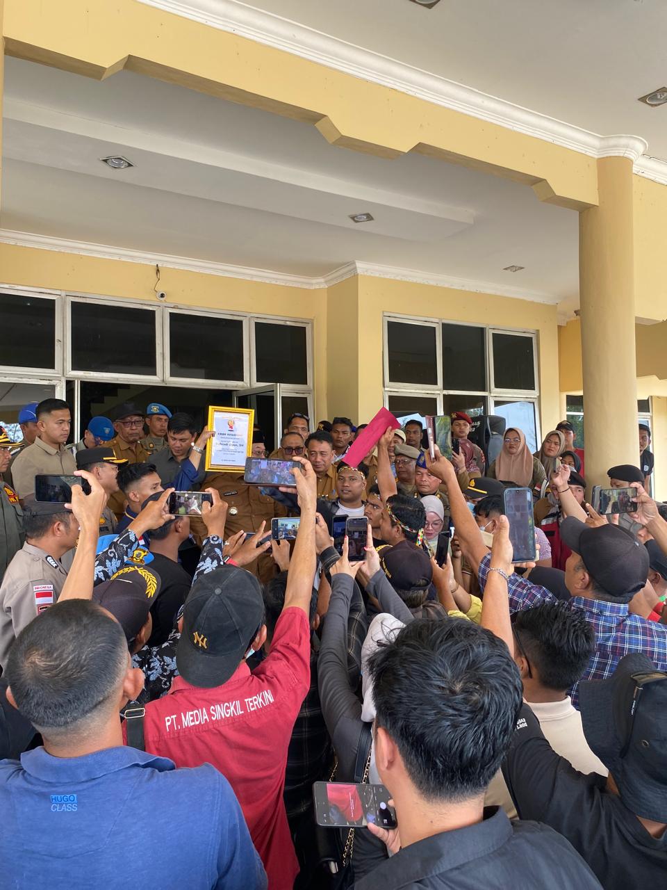 Sebagai bentuk sindiran tajam, massa secara simbolis memberikan “penghargaan rekor miring” dengan kategori “Bupati dengan Khayalan Tinggi di Dunia” kepada Bupati Aceh Singkil. Pemberian predikat unik ini disebut sebagai bentuk kritik terhadap sejumlah janji maupun pernyataan bupati yang dinilai tidak sejalan dengan kondisi nyata di lapangan. Melalui tuntutannya, massa mendesak pemerintah daerah untuk lebih serius menjalankan program kerja, melakukan evaluasi kinerja menyeluruh, serta membuka ruang dialog yang lebih luas dengan masyarakat.