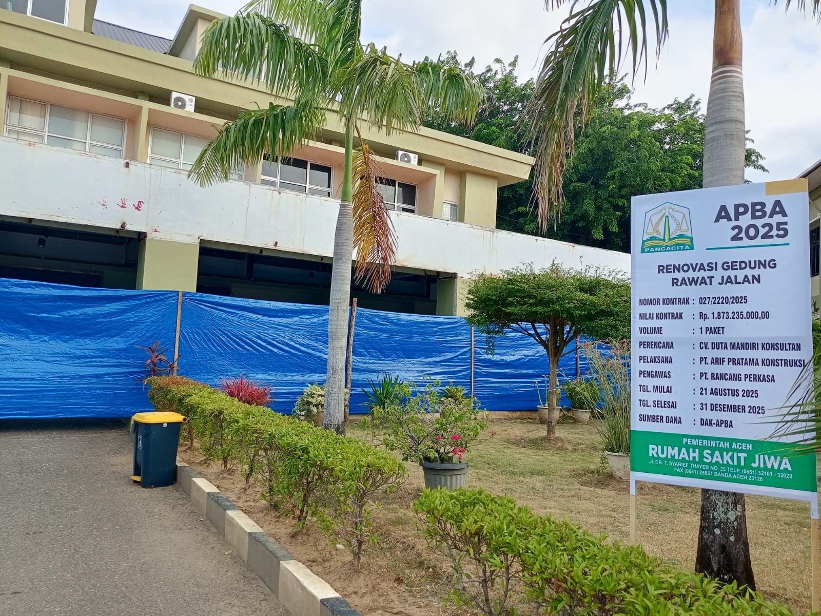 Banda Aceh |sarannews – Pemerintah Aceh melalui Rumah Sakit Jiwa (RSJ) dr. T. Syarif Abdulah di Banda Aceh, memulai pengerjaan renovasi gedung rawat jalan. Proyek yang dikerjakan oleh PT. Arif Pratama Konstruksi ini menelan anggaran mencapai Rp1.873.235.000,00 dan ditargetkan selesai pada 31 Desember 2025.