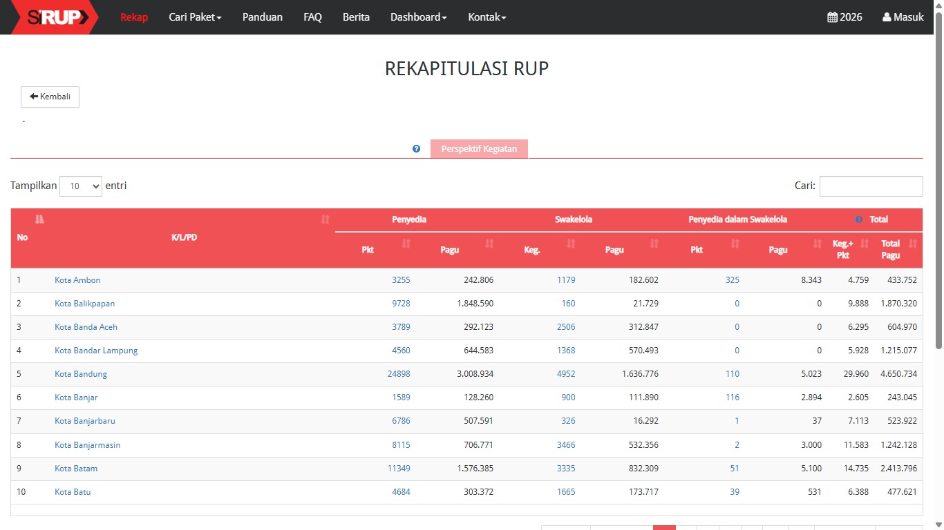Banda Aceh | SNN – Pemerintah Kota Banda Aceh mencatat total rencana pengadaan barang dan jasa (RUP) mencapai Rp604,970 miliar. Data tersebut menunjukkan bahwa skema swakelola menjadi yang paling dominan dari sisi anggaran, meskipun jumlah paket kegiatan lebih banyak melalui penyedia atau pihak ketiga.