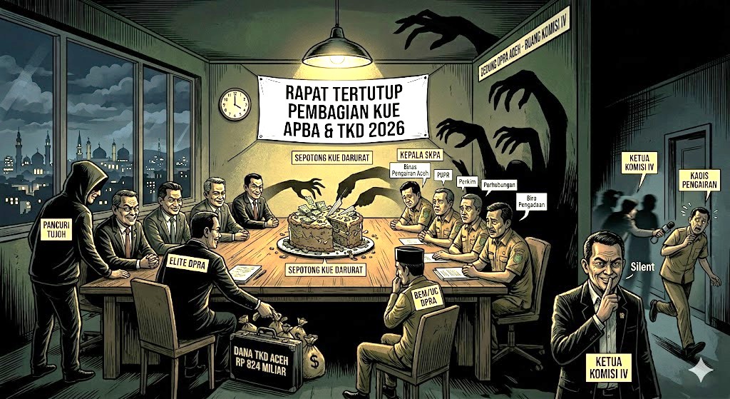 Alokasi dana tambahan Transfer ke Daerah (TKD) tahun 2026 senilai Rp 824 miliar diduga kuat telah menguap di meja negosiasi para elit, dana yang digelontorkan untuk Aceh yang seharusnya menjadi angin segar bagi para korban bencana alam. Dana bernilai fantastis ini sejatinya diamanatkan untuk membiayai program kedaruratan, mulai dari pembangunan hunian sementara hingga perbaikan infrastruktur jalan dan jembatan yang luluh lantak akibat cuaca ekstrem. Namun, alih-alih melihat aksi cepat tanggap yang berpihak pada nasib rakyat, publik justru disuguhi sebuah tontonan politik yang memuakkan. Teriakan lantang dari komisi terkait di legislatif yang sebelumnya menuntut transparansi dan mengancam memanggil para Kepala Satuan Kerja Perangkat Aceh (SKPA) ternyata hanya menyisakan aroma amis intrik politik kekuasaan. Di balik jubah pengawasan tersebut, tersembunyi sebuah sandiwara usang dari elite dewan yang kerap dilabeli secara sinis dengan julukan kelompok “Pancuri Tujoh” dibawah komando sang Pimpinan diduga kuat sekadar melancarkan gertakan politik untuk menekan eksekutif agar mau berbagi konsesi proyek.