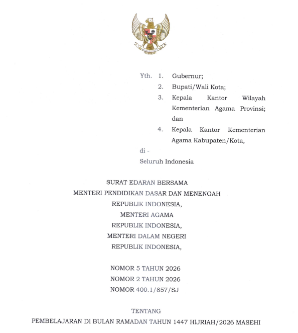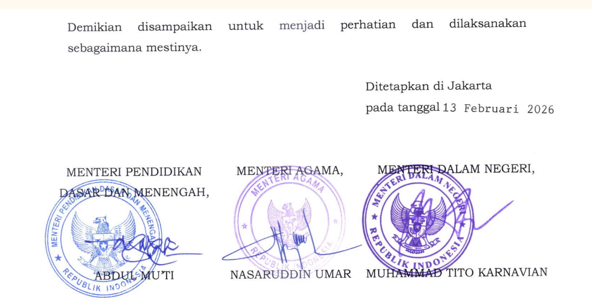 JAKARTA | SNN – Pemerintah akhirnya menerbitkan pedoman resmi mengenai jadwal kegiatan belajar mengajar (KBM) dan hari libur bagi satuan pendidikan selama bulan suci Ramadan dan Idulfitri 1447 Hijriah atau tahun 2026 Masehi. Ketentuan ini tertuang dalam Surat Edaran Bersama (SEB) Tiga Menteri yang ditandatangani di Jakarta pada tanggal 13 Februari 2026 oleh Menteri Pendidikan Dasar dan Menengah Abdul Mu’ti, Menteri Agama Nasaruddin Umar, dan Menteri Dalam Negeri Muhammad Tito Karnavian .