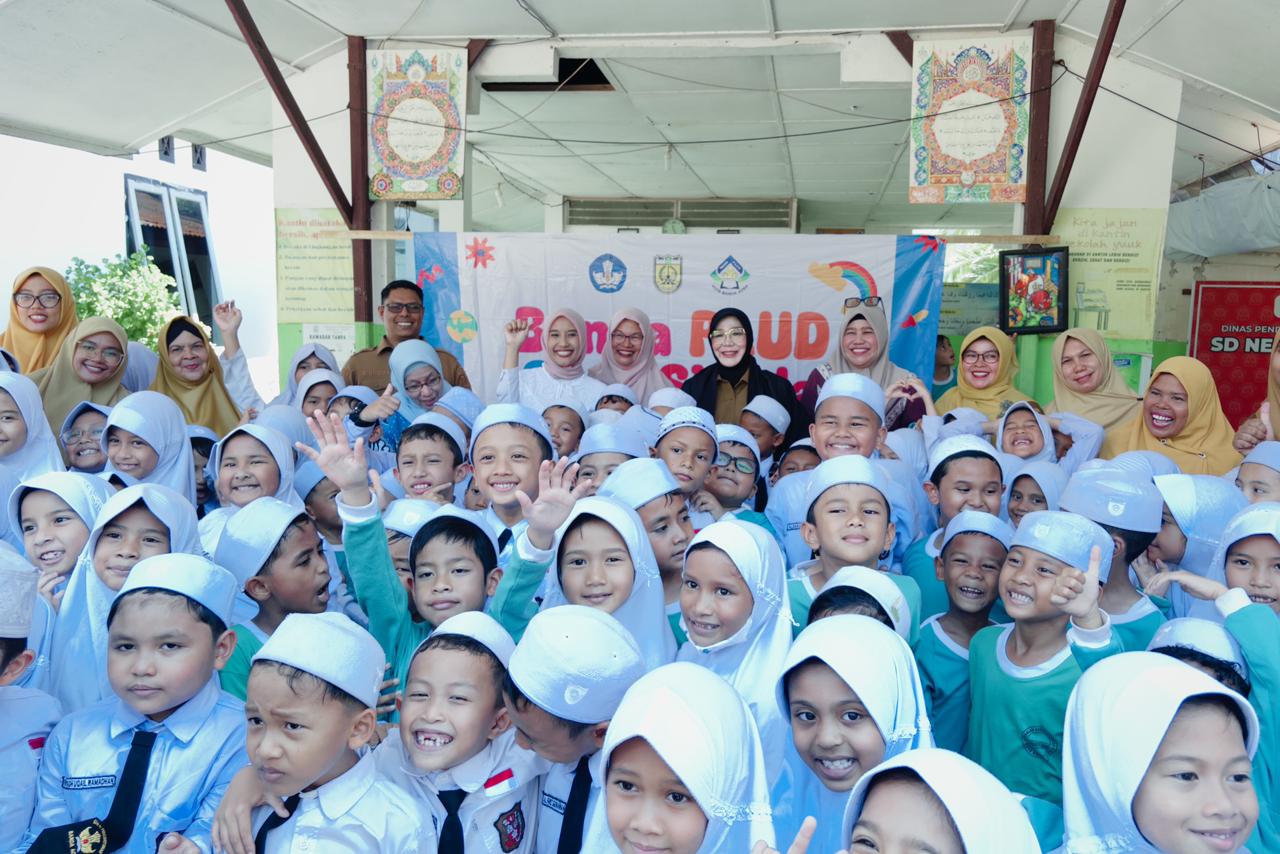 Wali Kota Banda Aceh, Illiza Sa’aduddin Djamal, berfoto bersama siswa SD Negeri 67 Percontohan Lam Lagang dalam kegiatan skrining Penyakit Jantung Bawaan (PJB) dalam rangka CHD Awareness Week 2026, Selasa (10/2/2026). Deteksi dini ini menjadi kunci penyelamatan masa depan anak-anak Aceh dari ancaman kelainan jantung bawaan. (Foto: Dok. Istimewah/Tengku Putri Isna)
