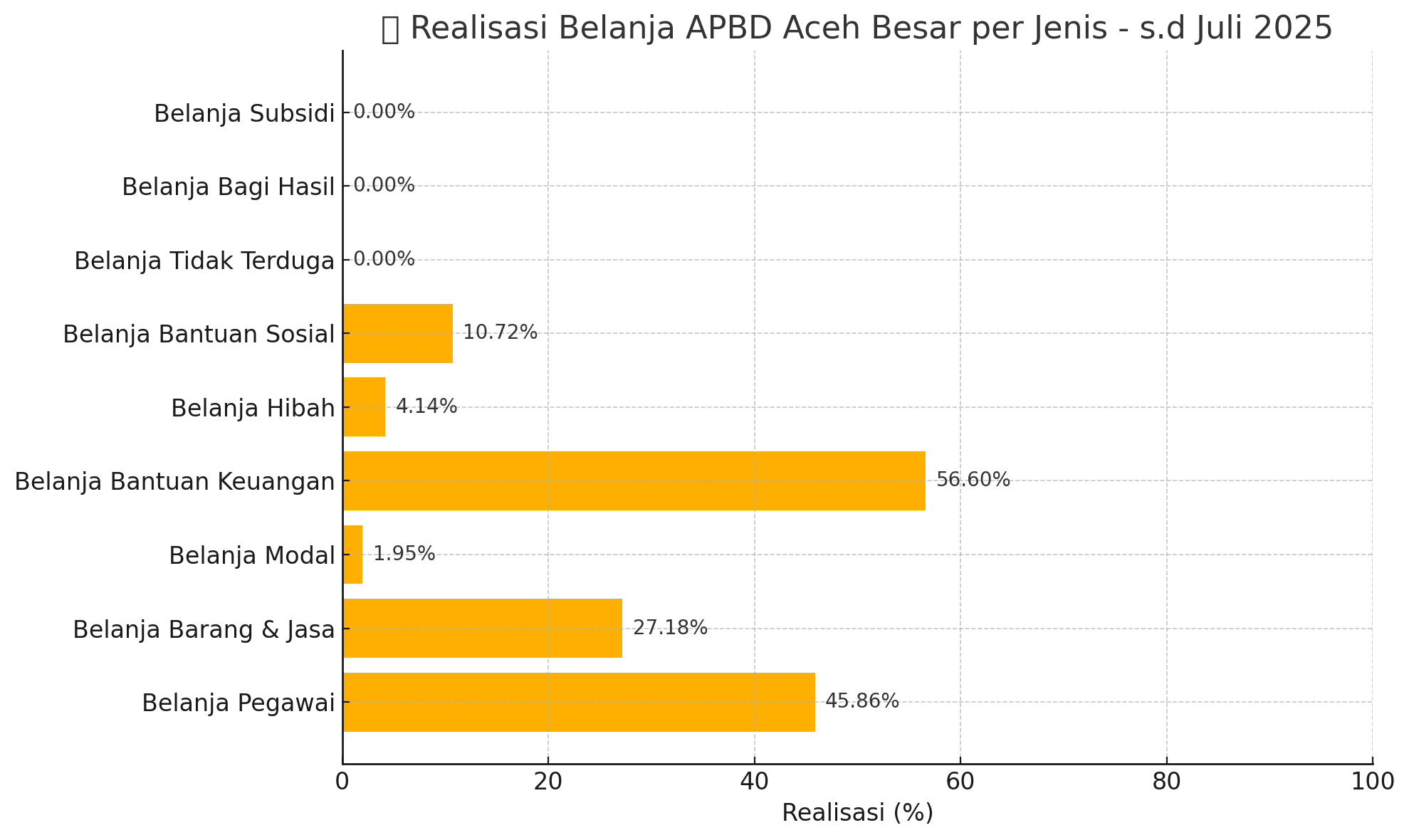 Aceh Besar | SaranNews – Pemerintah Kabupaten Aceh Besar menghadapi sorotan tajam publik setelah data resmi dari Sistem Informasi Keuangan Daerah (SIKD) Kementerian Keuangan menunjukkan lemahnya realisasi belanja daerah hingga akhir Juli 2025. Meski waktu telah memasuki triwulan ketiga, realisasi belanja modal yang seharusnya menopang pembangunan fisik dan pelayanan publik justru baru menyentuh angka 1,95 persen dari pagu yang ditetapkan.