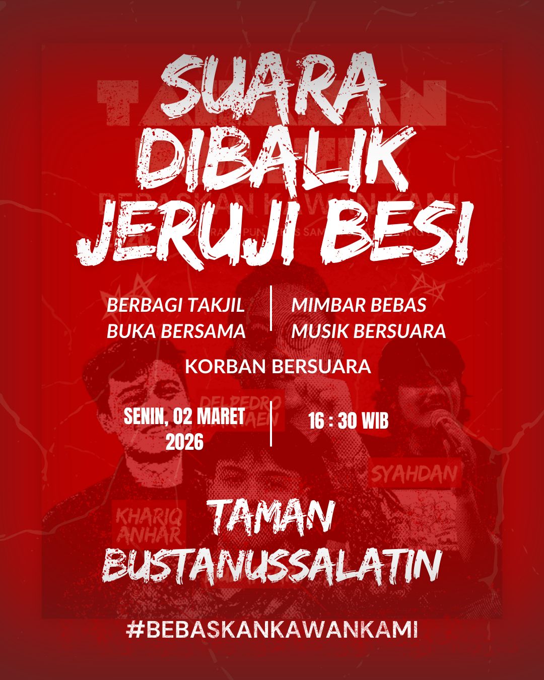 BANDA ACEH | SNN — Sebuah Kegiatan mimbar bebas yang bertajuk “Suara Dibalik Jeruji Besi”, Kegiatan yang memadukan aksi penyampaian aspirasi dan momen kebersamaan di bulan suci Ramadan ini akan berlangsung pada sore hari ini, Senin, 2 Maret 2026, mulai pukul 16.30 WIB. Acara tersebut akan dipusatkan di Taman Bustanussalatin atau yang lebih akrab dikenal oleh masyarakat setempat sebagai Taman Sari, Kota Banda Aceh. Kegiatan ini diselenggarakan sebagai bentuk dukungan moral dan penggalangan solidaritas publik.