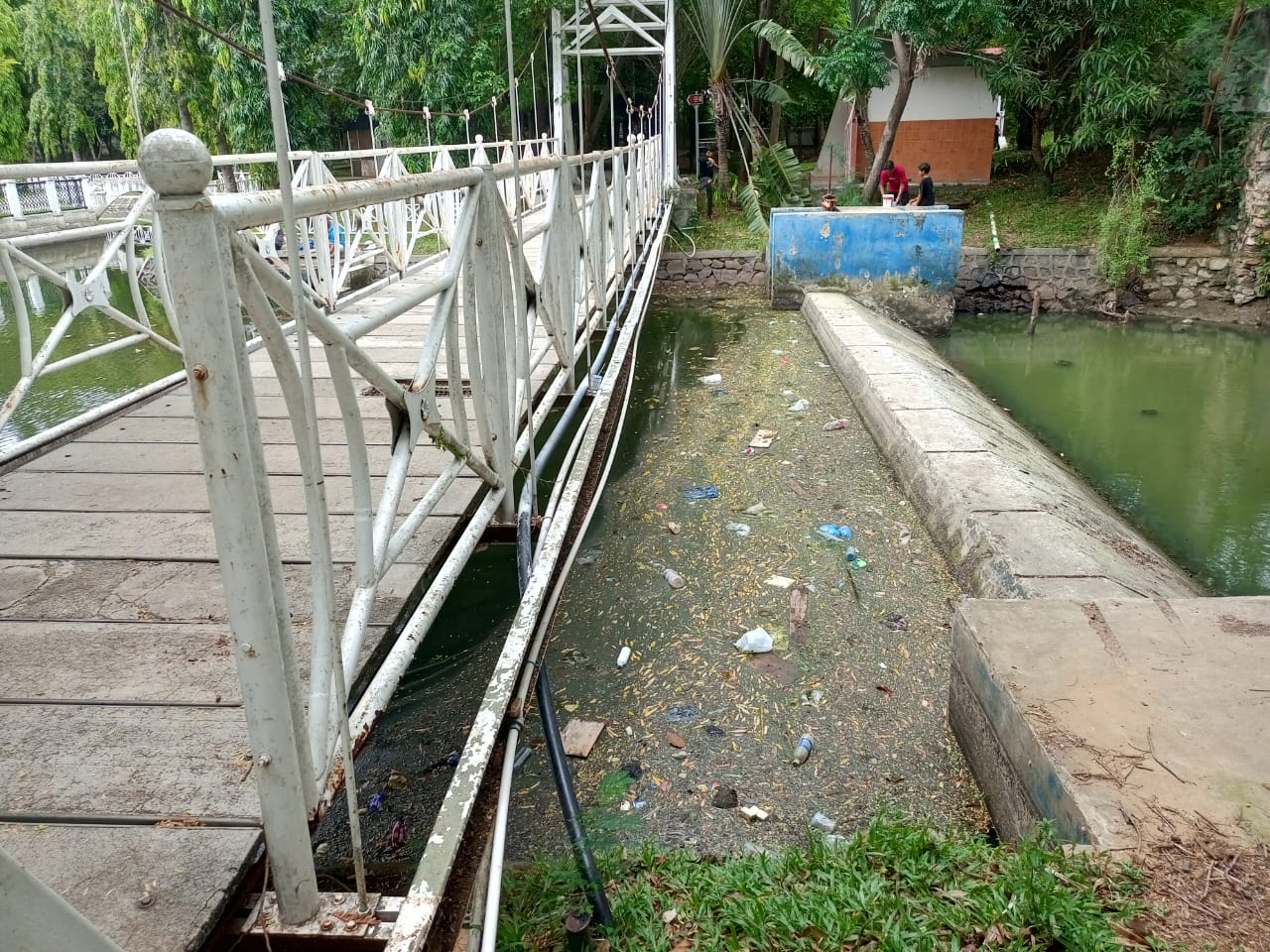 Di banyak titik, sampah berserakan. Fasilitas umum seperti bangku, lampu taman, dan pagar pembatas tampak rusak. Toilet umum atau MCK tak hanya jorok dan bau, tapi juga tak layak pakai, dengan lampu rusak dan sanitasi memprihatinkan. Air mancur dibiarkan mati, dan sungai kecil yang dulunya menjadi elemen estetika taman kini berubah menjadi selokan terbuka, penuh limbah dan plastik.