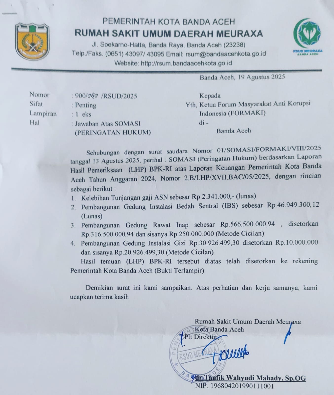 BANDA ACEH – SaranNews | Nama Plt. Direktur RSUD Meuraxa, dr. Taufik Wahyudi Mahady, Sp.OG, terancam masuk dalam laporan pidana yang akan dilayangkan oleh LSM Forum Masyarakat Anti Korupsi Indonesia (FORMAKI). Ancaman serius ini merupakan buntut dari kegagalan pihak rumah sakit melunasi sisa temuan kerugian negara dari BPK sebesar Rp270,9 juta dan hanya menawarkan skema pembayaran secara cicilan.