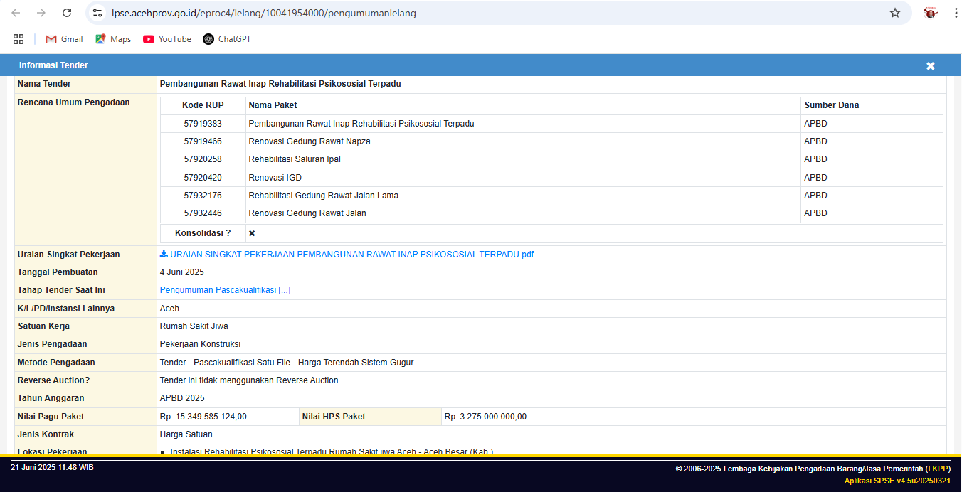 Daftar Paket Tender yang Tayang di LPSE Aceh :