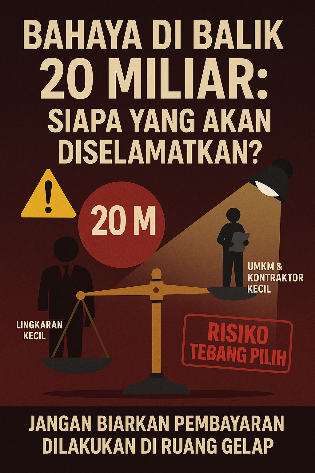 Publik, dan terutama para rekanan pihak ketiga yang haknya tertahan, berhak cemas. Tanpa transparansi yang radikal, dana Rp 20 miliar ini rawan menjadi bancakan. Bahaya nyata di depan mata adalah praktik tebang pilih; di mana pembayaran diprioritaskan bukan berdasarkan urgensi atau urutan waktu penyelesaian pekerjaan (First In First Out), melainkan berdasarkan kedekatan dengan lingkaran kekuasaan atau kesediaan memberikan “komisi” di bawah meja. Jika ini terjadi, maka rekanan kecil dan UMKM yang tidak punya akses politik akan kembali menjadi korban, dipaksa menunggu dalam ketidakpastian yang bisa mematikan usaha mereka.