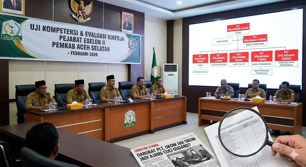 ACEH SELATAN | SNN – Pernyataan Ketua Panitia Seleksi (Pansel) sekaligus Plt Sekda Aceh Selatan, Diva Samudra Putra, S.E., M.M., pada Sabtu (7/2/2026) dimedia, terdengar normatif dan menyejukkan. Ia menyebut, uji kompetensi (Ukom) terhadap 17 pejabat Eselon II dan evaluasi kinerja terhadap 4 kepala dinas adalah upaya “peningkatan profesionalisme” dan “penyegaran organisasi”. Sebuah diksi standar birokrasi yang sering kita dengar.