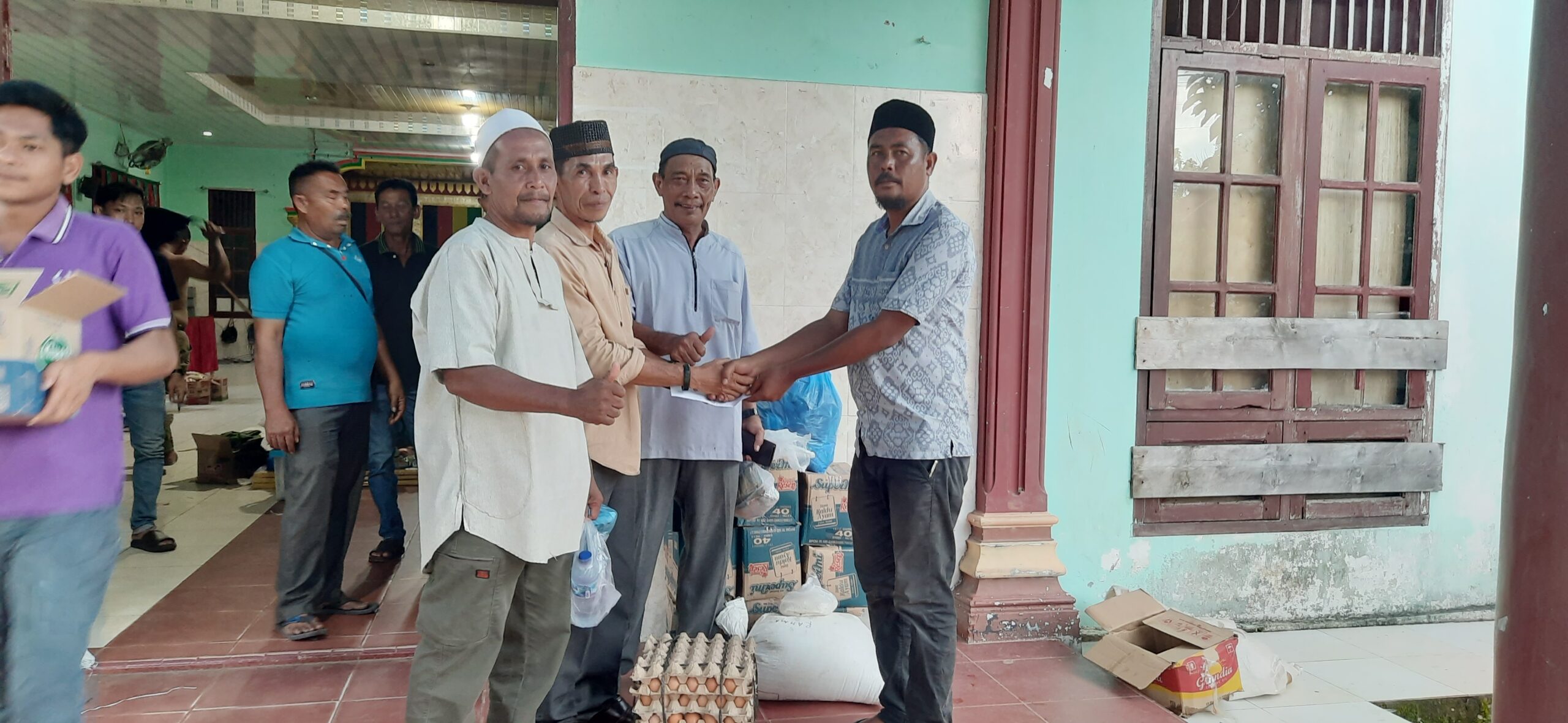Momen penyerahan bantuan kemanusiaan berupa sembako dan uang tunai dari masyarakat Gampong Pulokambing kepada perwakilan Gampong Kota Fajar untuk disalurkan kepada para korban kebakaran, Minggu (29/3/2026). Bantuan ini merupakan wujud nyata kepedulian dan gotong royong warga Kecamatan Kluet Utara dalam membantu sesama yang tertimpa musibah. (Foto: Sumber Dok. SNN/Khairul Badri).