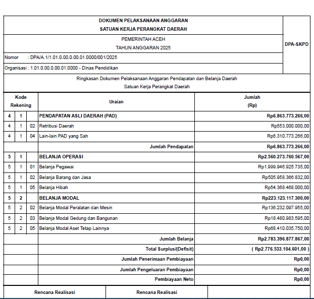 Dokumen Pelaksanaan Anggaran (DPA) Tahun Anggaran 2025 untuk Dinas Pendidikan Aceh menunjukkan angka-angka besar, dengan total belanja mencapai Rp2,78 triliun, dan defisit luar biasa sebesar Rp2,77 triliun. Namun yang mengundang tanda tanya adalah: apakah dokumen tersebut masih relevan dengan visi-misi Gubernur terpilih dan arah kebijakan baru, terutama dalam konteks efisiensi nasional yang sedang didorong oleh Pemerintah Pusat?