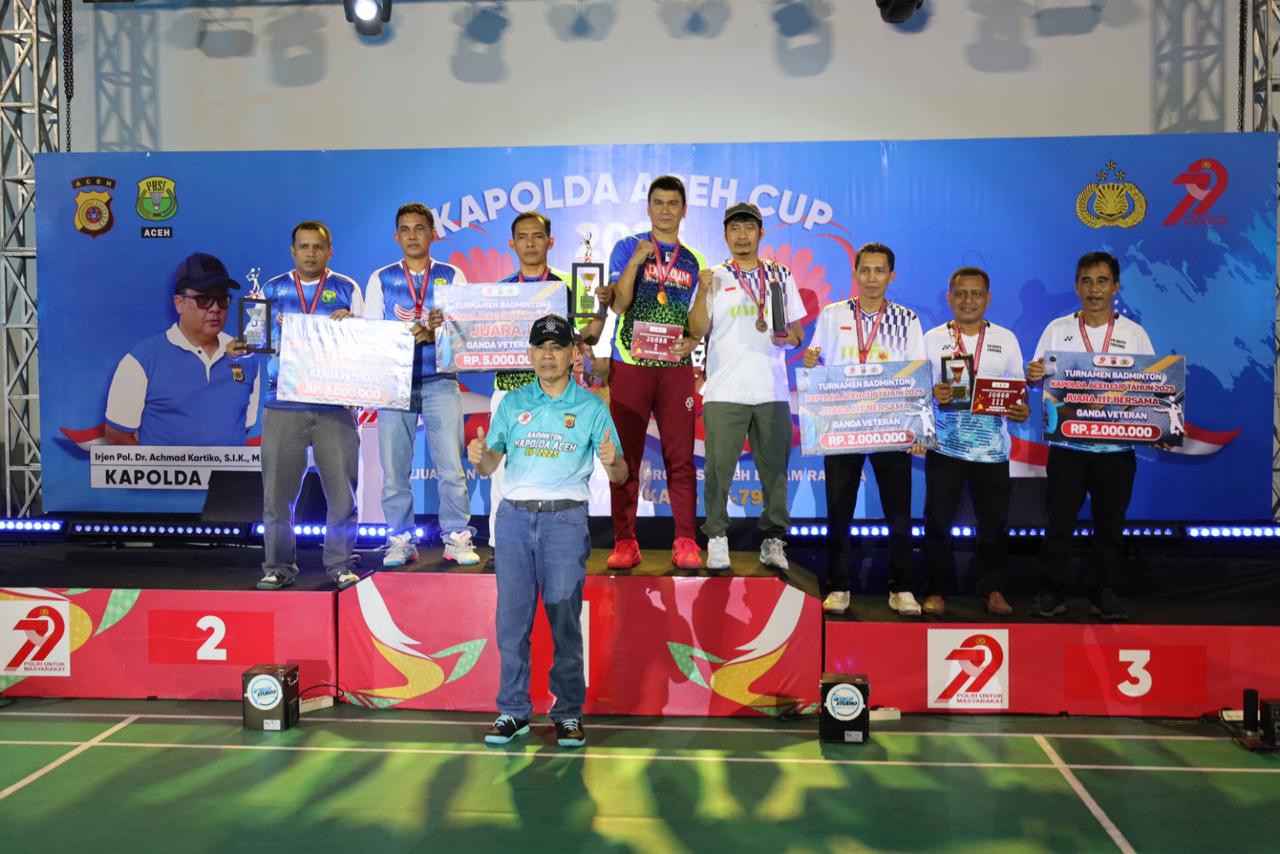 Banda Aceh | SaranNews – Wakapolda Aceh, Brigjen Pol. Ari Wahyu Widodo, secara resmi menutup Kejuaraan Badminton Kapolda Aceh Cup 2025 di Gedung Olahraga (GOR) KONI Aceh, Minggu malam, 27 Juli 2025. Penutupan turnamen ditandai dengan laga final ganda veteran beregu 98 yang menjadi penentu gelar juara.