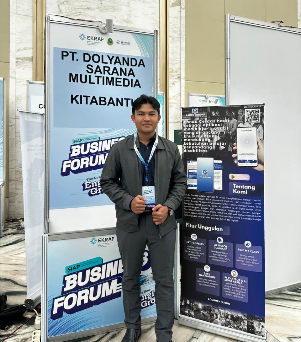 “Pandu Cerdas hadir sebagai aplikasi AI untuk menghadirkan belajar mandiri, mudah, dan inklusif,” demikian deskripsi yang tertera pada booth pameran PT Dolyanda Sarana Multi Media.